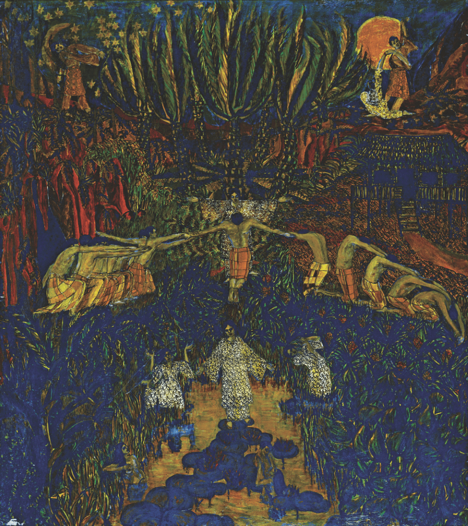 This ode to nature is Patrick Ng Kah Onn, uniquely detailed narrative composed of three distinctive zones, namely the sky, the upper world, the earth, the middle world, and the water or lower world located at the foreground of the painting. At the top of the canvas is depicted two young men dressed in Malay costume one set against the stars and the other against the full moon, pouring the seeds of life onto the earth. Tree plants surge upwards, in the centre a woman with outstretched arms is blessing the homage of the young man and other youths in kneeling positions similar to the Balinese kechak dance. In the lake, there is an embracing couple not unlike the yaksha of Indian art.