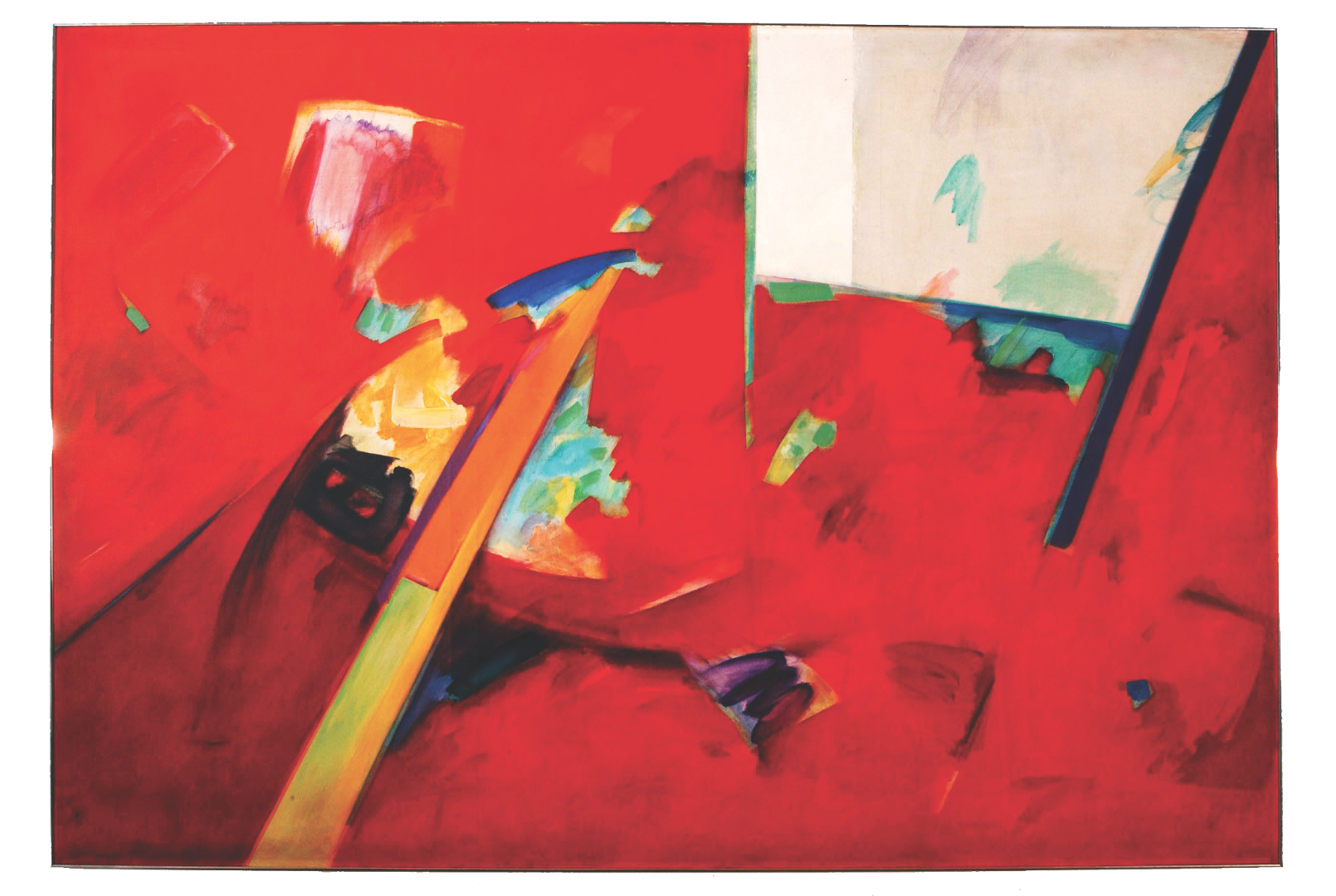 (1929-2011) is made up of bright red, oranges, yellows and whites. The window is seen as a tilted white rectangular shape located at the top and right hand corner. The bottom left is a shaft of yellow energy that enters into the picture and streaks towards the window.