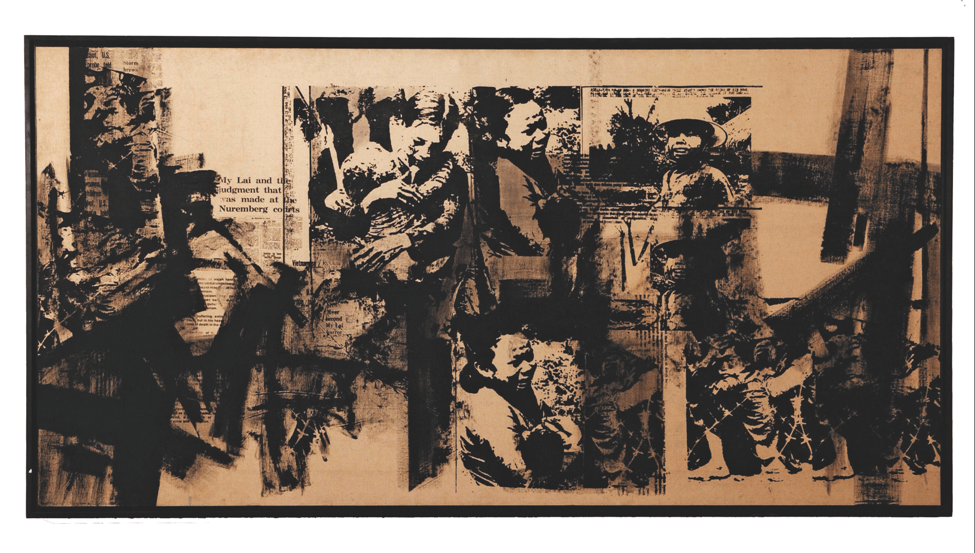 Nirmala Dutt Shanmughalingam (1941-2016) produced Vietnam using images from the mass media as a statement on the brutality of the Vietnam war. She reveals an important paradox in Vietnam: How is it that the US condemned Nazi war crimes during the Nuremberg trials yet drop napalm bombs to annihilate Vietnamese villages?