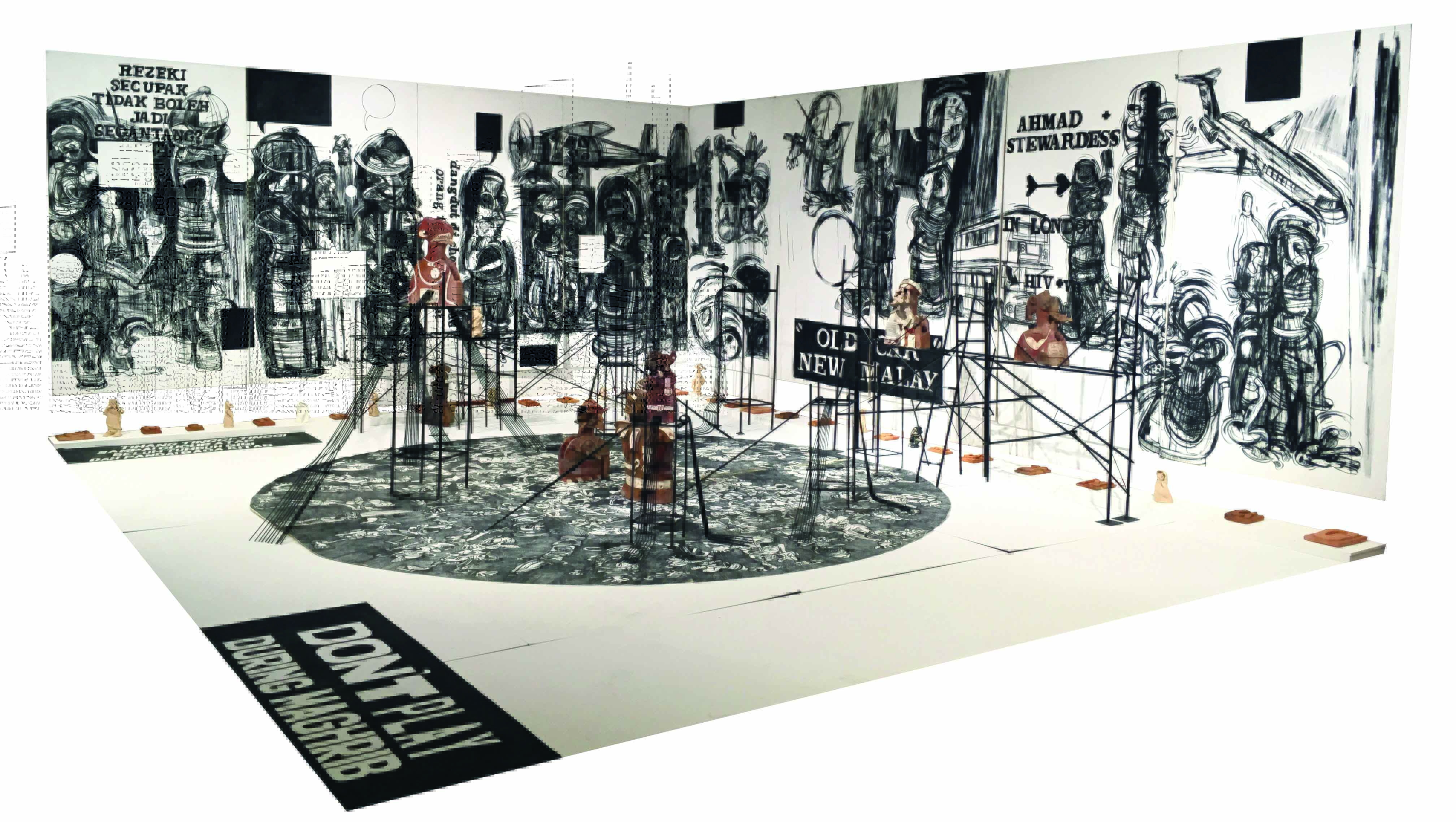 The highly charged installation complete with drawings and wall graffiti quotes both in English and Bahasa Malaysia language alongside grotesque ceramic figures had represented Malaysia in the Venice Biennale in 1997.