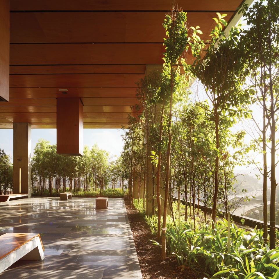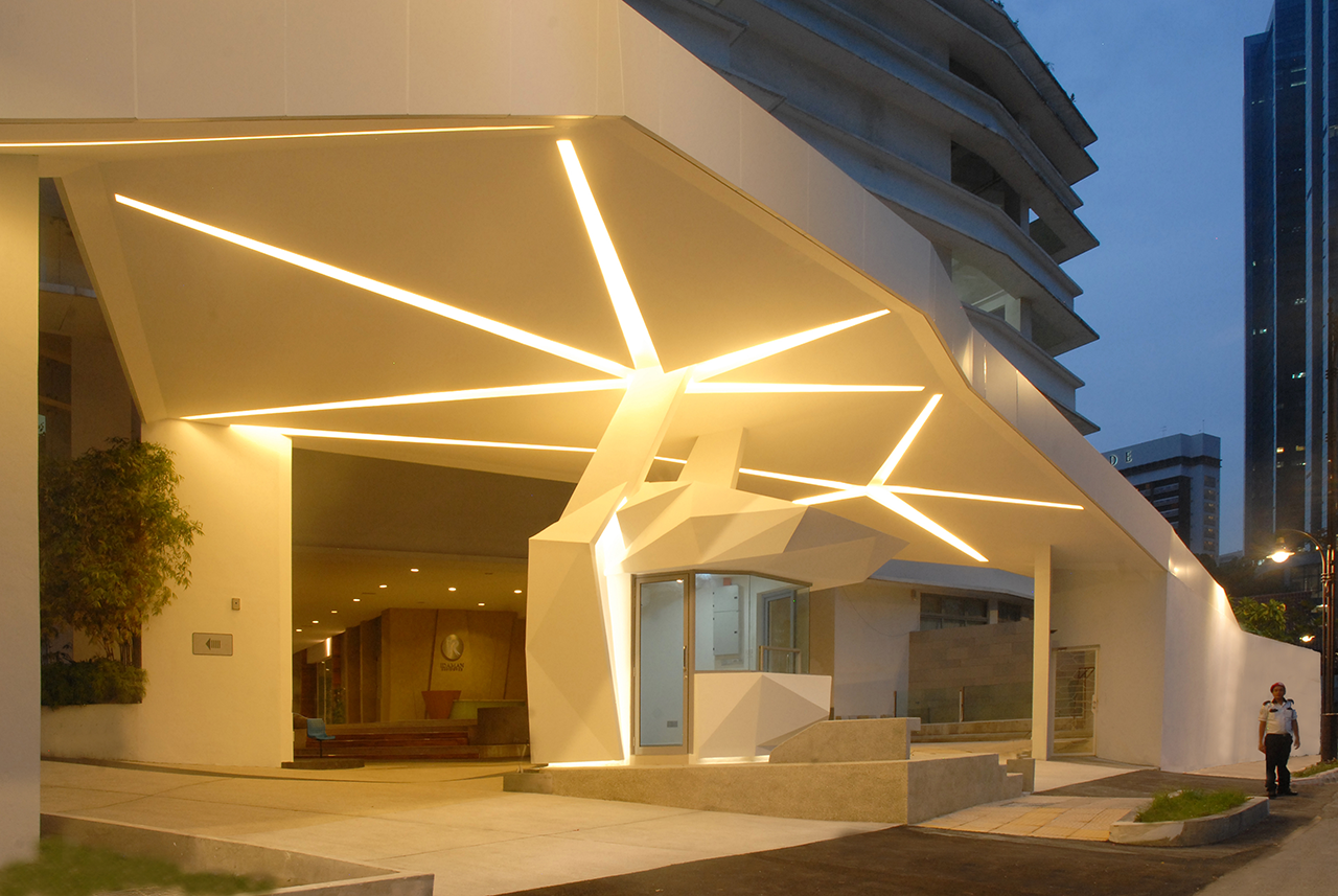 Which brings us on appropriately to Point 92 that articulates this philosophy beautifully. Staying true to their intention of creating an ambience, visitors will get to experience a breathtaking view of Damansara Perdana as they arrive at the lobby through a gradual escalating step way above the drop-off. It is here that the viewer finds the opportunity to fully drink in the view by intuitively placing precast concrete benches that encourage respite, while wooden lanterns with marine plywood ceilings buttoned tightly against a raw concrete undercroft creating a soothing canopy.