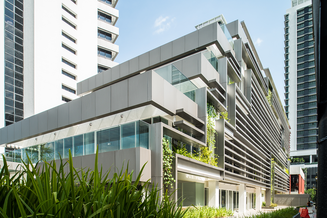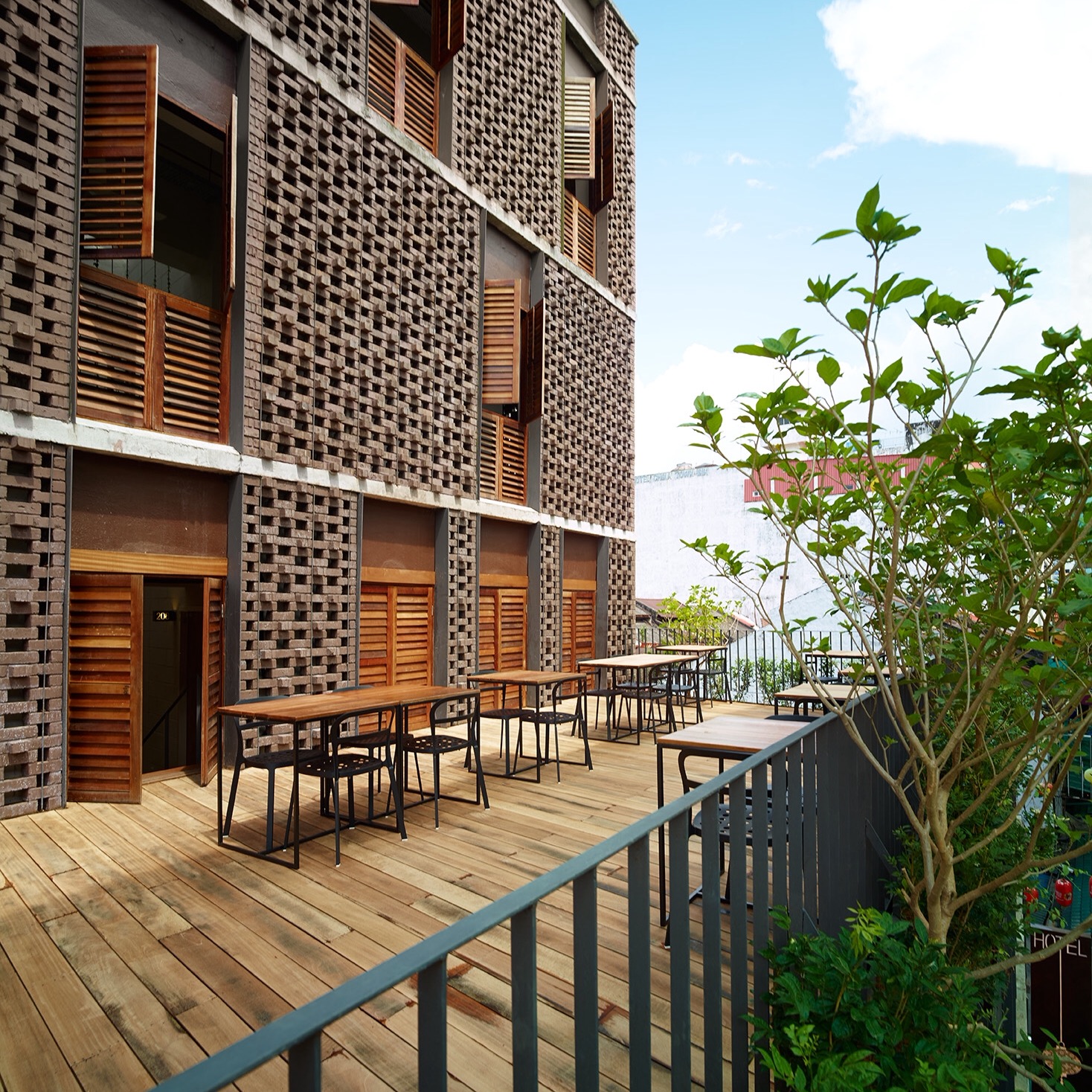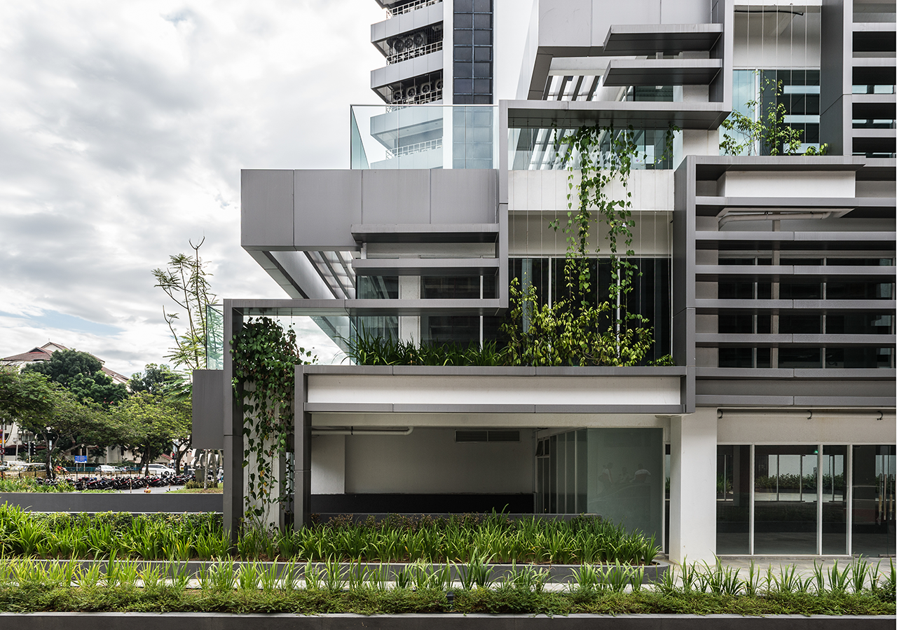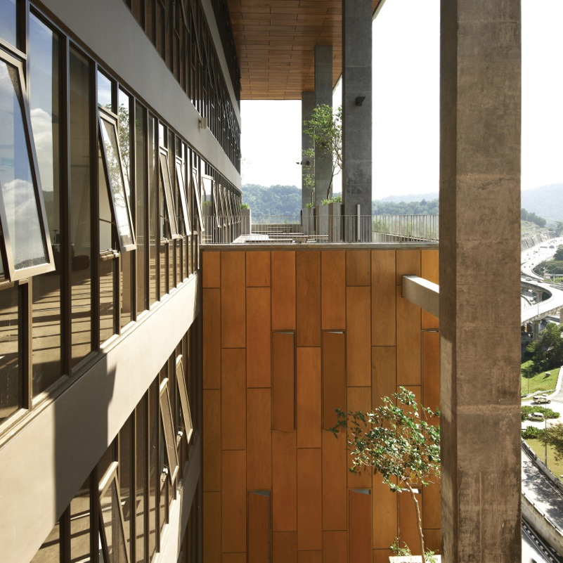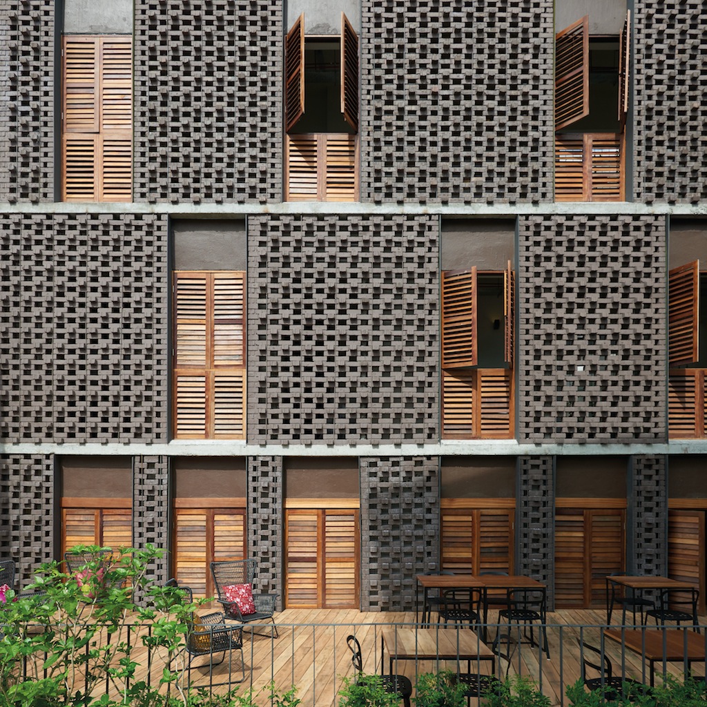 The façade was designed to be less obtrusive and to blend in harmoniously with the hustle and bustle of the historical road. Locally manufactured, dark brown clay bricks from Johor Bahru were used. Several laying methods were studied to arrive at the final form that would allow for sufficient openings as well as provide the façade with a three-dimensional texture.