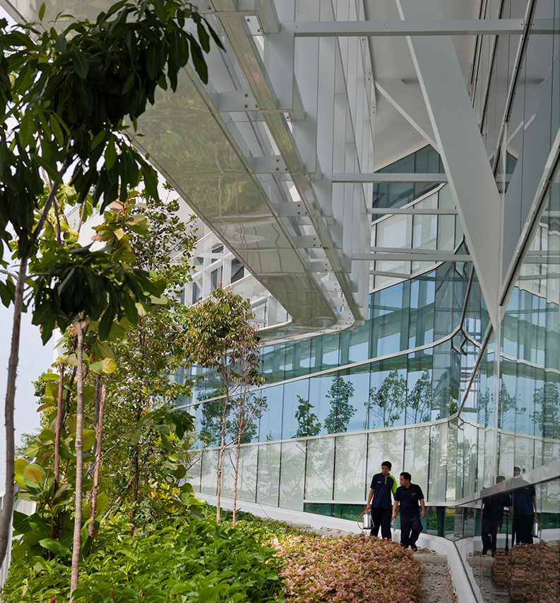 In the tropics especially, high-rises are traditionally the most unecological of all buildings, often wasting up to 30% more energy than lower structures built with the same materials. Yeang uses walls of plants, photovoltaics, scallop-shaped sunshades, advanced ventilation and whatever he can to collect water and breezes.
