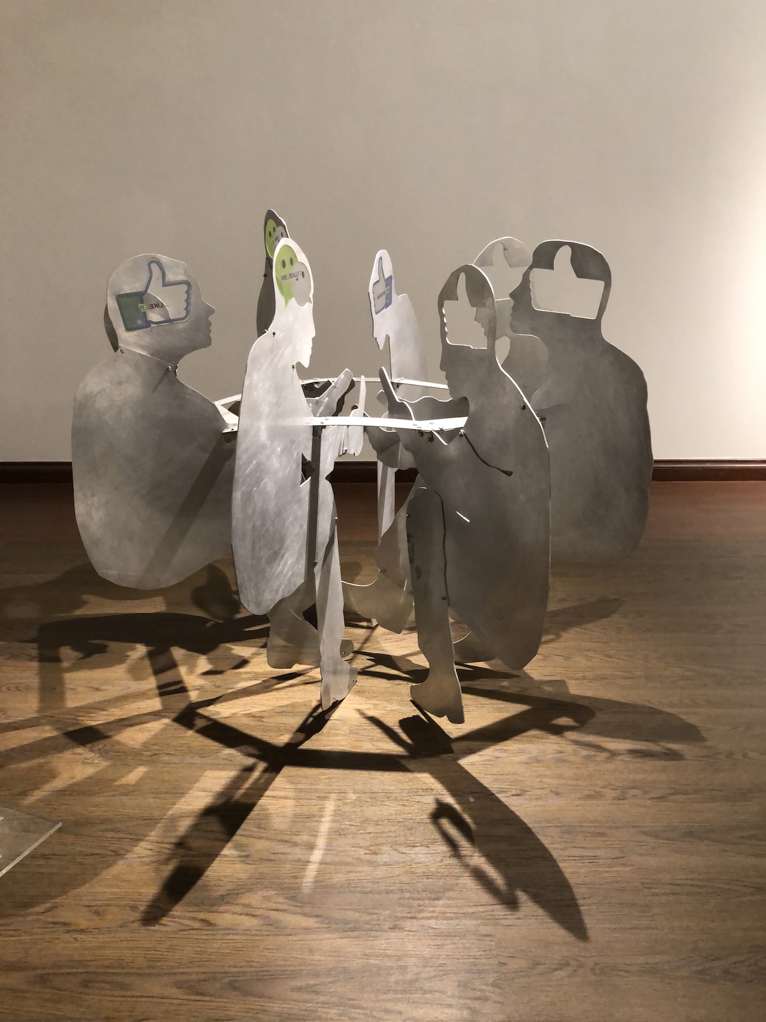 For example, the piece entitled “Non Face to Face” shows a group of human figures that are so engrossed in their gadgets and mobile apps to communicate that they do not talk to each other despite being seated together.
